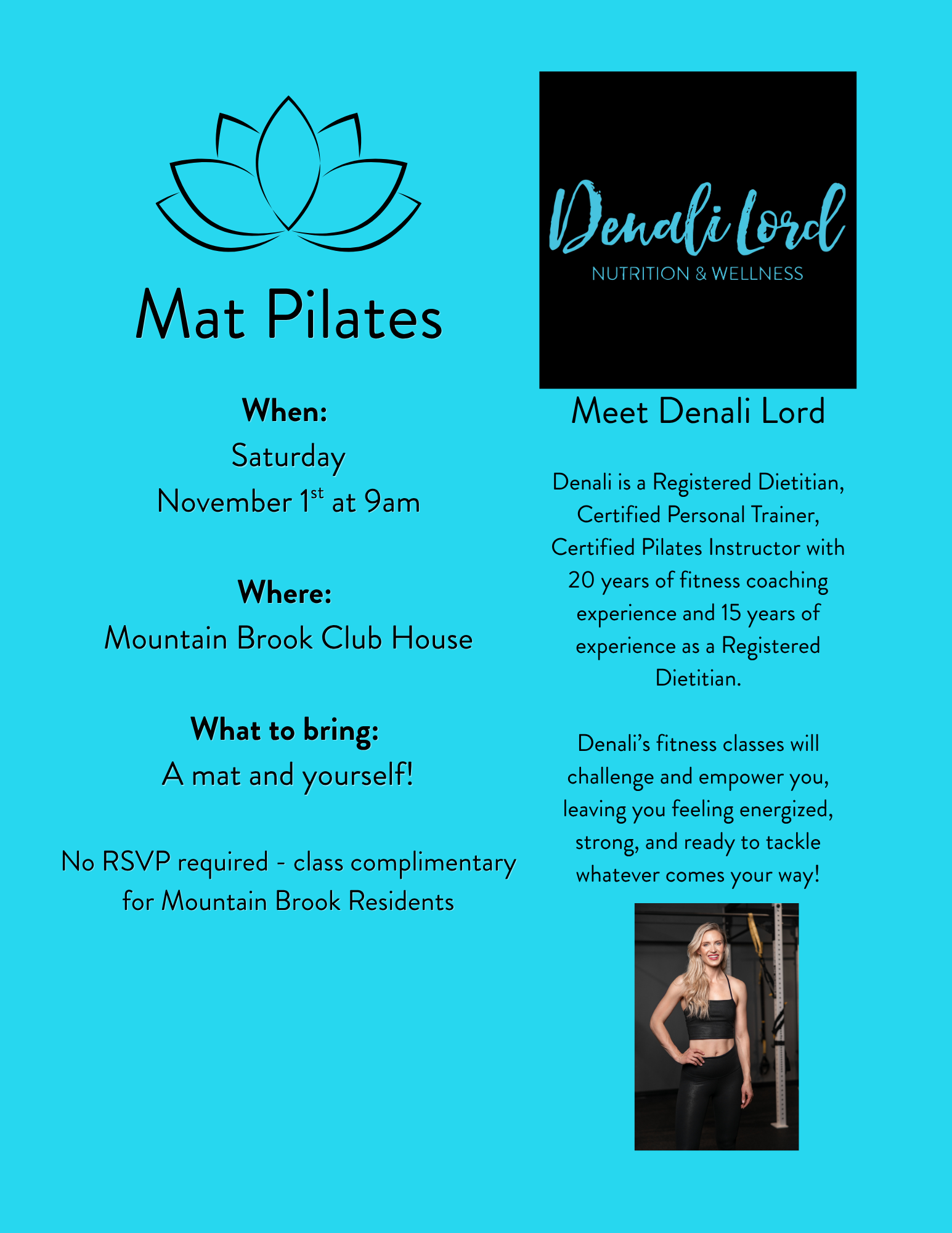 Join us from 9 - 10 a.m. for an energizing Pilates session at The Lodge in the fitness center/ zen room with the resident trainor, Denali. Space is limited to the first 10 residents to email mountainbrook@coherelife.com, so be sure to reserve your spot today!
